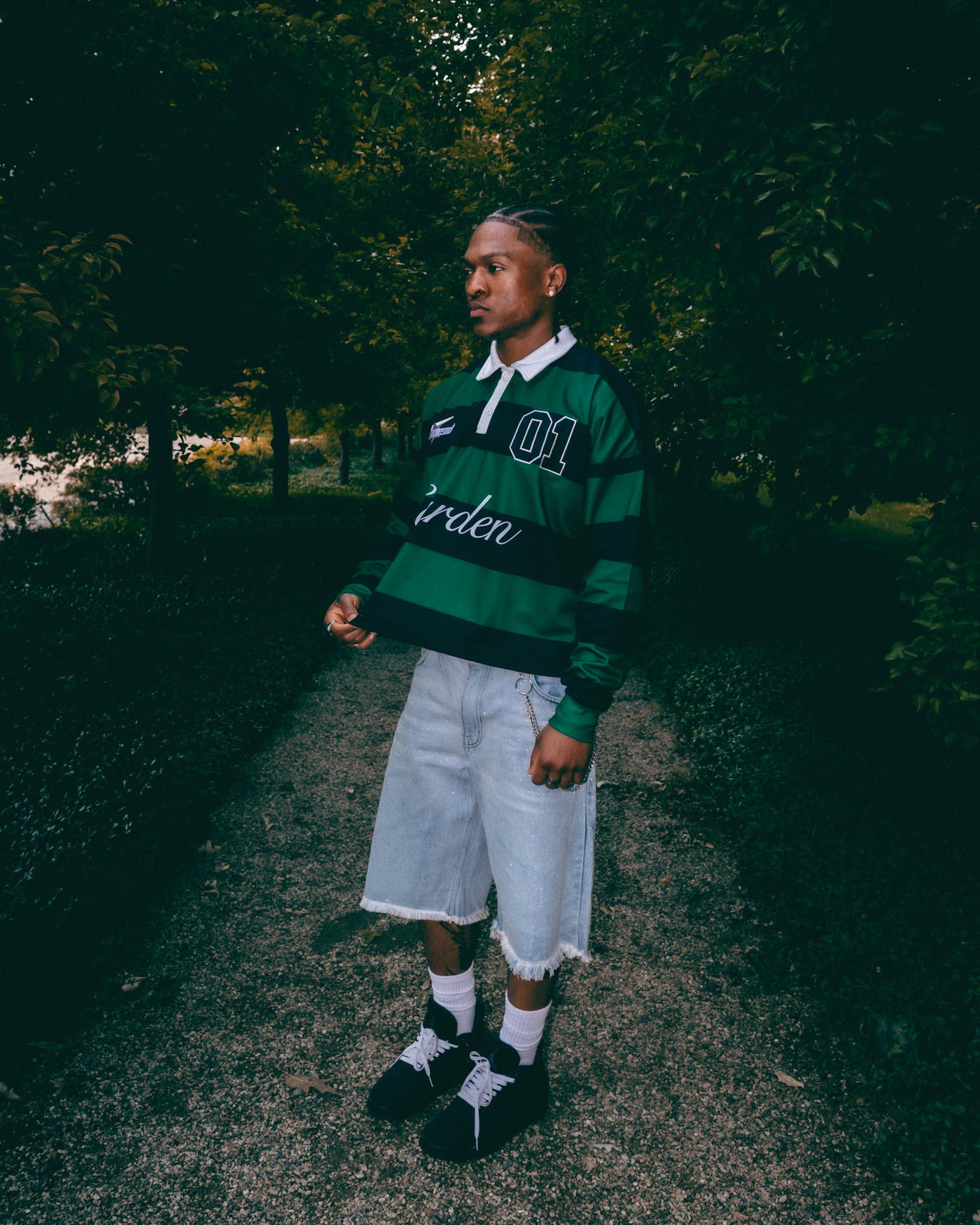 THREE BUTTON RUGBY COLLAR. RIB KNIT CUFFS.